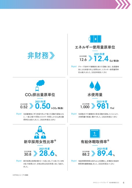 非財務エネルギー使用量原単位CO₂排出量原単位水使用量新卒採用女性比率※有給休暇取得率※グループ全体での継続的な省エネ活動に加え、生産量増加による歩留の向上効果もあり、エネルギー使用量原単位は減少しました。2020年度比-1.3%)新卒採用は採用計画10~15名に対して14名(うち女性4名)の採用となり、女性比率は2020年度に対して減少しました。有給休暇取得率は80%以上を目標とし、計画的な有給休暇取得を継続推進しました。2020年度比+1.2%)生産量増加に伴う歩留の向上や省エネ活動の実施とともに、一部工場での再生エネルギー利用によりCO2排出量原単位は減少しました。(2020年度比-3.9%)生産拠点での継続的な保全活動を実施したことにより、水使用量の削減に繋がりました。2020年度比-1.9%)PointPointPointPointPoint2020年度2020年度2020年度2020年度2020年度2021年度2021年度2021年度2021年度2021年度12.60.521,00030.888.212.40.5098128.689.4GJ/製造tt-CO₂/製造t千㎥%%1※タキロンシーアイ単体6