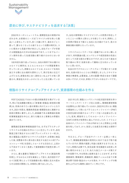 歴史に学び、サステナビリティを追求する「決意」2050年カーボンニュートラル、循環型社会の実現が叫ばれる中、お客様のニーズは「リサイクル材を用いた製品」へと変化しています。安く大量に作り、湯水のごとく使って、要らなくなったら捨てるという消費の時代を、ついに根本から見直す時が来ました。当社グループが手掛ける樹脂製品の大半は石油由来であり、いつまでもバージン原料を使った生産活動に頼り続けるわけにはいきません。100年前を振り返ってみると、当社の発祥である瀧川セルロイド工業所は、もともとセルロイドの再製事業を行っていました。再製セルロイドとは、セルロイド生地を加工する際に出る端材を原料として、再び生地に仕立て上げたもの。新製生地と全く遜色ない仕上がりが高く評価され、業容拡大のきっかけになったと伝え聞いています。当社の黎明期にサステナビリティの思想が存在していたことへの驚きと誇らしさを感じています。同時に、この思想が現在まで脈々と当社に生き続けており、我々の事業活動の根幹となっています。リサイクルというテーマは一筋縄ではいかない難しさがあり、材料調達の面、コンパウンドや成形技術の改良にあたって大変な胆力が要るのですが、あらためて過去の取り組みに学び、知恵を絞って難局に立ち向かっていきたいと思います。社会の中でタキロンシーアイグループが果たすべき使命を、社員の皆さんとともに再確認しました。リサイクル事業の事業性、必要資金、人材の配置・育成を含めて課題は多いですが、その分、非常にやりがいのあるテーマです。樹脂のリサイクル・アップサイクルで、資源循環の仕組みを作る中計「CX2023」では6つの重点実施項目を掲げています。特に「社会課題の解決」と「新事業・新製品・新技術の獲得」は、将来のありたい姿の実現に向けたエンジンとなります。2021年度は、環境負荷低減・循環型社会に貢献する技術の開発に着手しました。新組織である循環適応型素材事業推進部を中心に、新たな種まきと事業化の準備を進めています。循環適応型素材事業推進部では、まずはプラスチックリサイクルの仕組みを作ることに注力しています。自社製造工程で発生するロス材「プレインダストリー材」を、他工場製品に転用するリサイクル方法や、お客様に納品した後、消費者の手に渡る前に発生する加工ロス材「プレコンシューマ材」を回収しリユースする方法など、上流から下流までくまなく見渡して資源循環の可能性を探っています。さらに、最も重要な「樹脂のアップサイクル(創造的再利用)」、すなわちロス材を資源として捉え、処方設計やアロイ(改質)等によって付加価値の高い樹脂に生まれ変わらせる技術の開発にも、本格的に乗り出しました。2021年3月、樹脂コンパウンドの処方設計技術を持つマーベリックパートナーズ社に出資し、環境配慮型樹脂の品質向上に取り組んでいるほか、2022年2月には、樹脂の補強材として用いるパラミロンナノファイバー(PNF)の安定生産を計画するユーグリード社への出資も行いました。従来、補強材としてセルロースナノファイバー(CNF)の研究が世界的に進んできましたが、ミドリムシ由来のナノファイバーであるPNFはこれと同等以上の性能を有しており、かつ、安定した生産方式の確立も期待できます。今まさに、グループ会社やパートナー企業と一体となって、環境配慮型樹脂の実用化に向けて全力で取り組んでいますが、開発が進展し利益に結実するまでには、もう少し時間が必要です。安定品質・安定調達をお約束し市場に根付かせることこそ、私たち加工メーカーが果たすべき役割です。今は性急に結果を追うことはせず、まずは建築資材、環境資材、高機能材、機能フィルムの全ての事業分野で技術・製品のレベルを高め、マーケティングの精度を上げながら確実に進めていく考えです。9タキロンシーアイグループ統合報告書2022