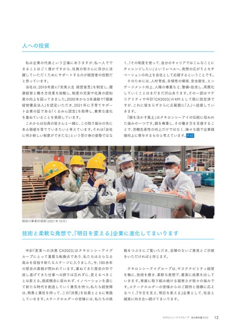 人への投資私は企業の代表という立場にありますが、私一人でできることはごく僅かですから、社員の皆さんに存分に活躍していただくためにサポートするのが経営者の役割だと思っています。当社は、2019年度に「充実人生経営宣言」を制定し、健康経営と働き方改革を始動し、制度の充実や社員の認知度の向上を図ってきました。2020年から3年連続で「健康経営優良法人」を認定いただき、2021年に子育てサポート企業の証である「くるみん認定」を取得し、着実な進化を重ねていることを実感しています。これからは社員の皆さんと一緒に、この取り組みの先にある価値を育てていきたいと考えています。それは「会社に何か新しい制度ができたな」という受け身の姿勢ではなく、その制度を使って、自分のキャリアではこんなことにチャレンジしたい」というレベルへ、発想の広がりとモチベーションの向上を会社として応援するということです。そのためには、人材育成、多様性の確保、安全衛生、エンゲージメント向上、人権の尊重など、整備・拡充し、高質化していくことはまだまだ沢山あります。その一部はマテリアリティや中計「CX2023」のKPIとして既に設定済ですが、これに留まらずさらに広範囲に「人」へ投資していきます。「個を活かす風土」はタキロンシーアイの伝統に培われた強みの一つです。個を尊重し、その働き方を支援することで、労働生産性の向上だけではなく、様々な面で企業価値向上に寄与するものと考えています。P.43揖保川事業所視察(2021年10月)技術と柔軟な発想で、明日を変える』企業に進化してまいります中計「変革への決意CX2023」はタキロンシーアイグループにとって重要な転換点であり、私たちはさらなる高みを目指す新たなステージに入りました。今、100余年の歴史の真価が問われています。重ねてきた歴史の中で成し遂げてきた仕事への誇りは忘れずに、変えるべきことは変える。既成概念に捉われず、イノベーションを通じて新たな時代を創造していく勇気を持つ。私たち経営陣は、熱意と責任を持って、この「決意」を社員とともに実践していきます。ステークホルダーの皆様には、私たちの挑戦をつぶさにご覧いただき、忌憚のないご意見とご示唆をいただければと存じます。タキロンシーアイグループは、サステナビリティ経営を軸に、技術を磨き、柔軟な発想で、着実に成果を出していきます。実直に取り組み続ける誠実さが我々の強みです。ステークホルダーの皆様からのご期待と信頼に応えるべく、今日を支え、明日を変える』企業として、社会と誠実に向き合い続けてまいります。12