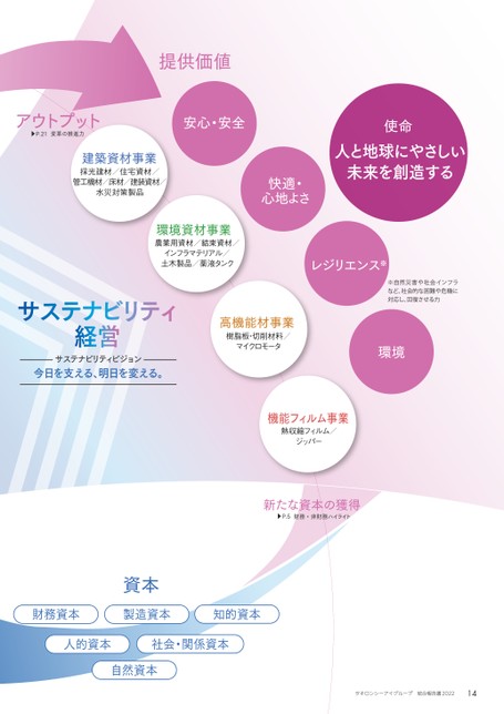 レジリエンス快適・心地よさ安心・安全環境使命人と地球にやさしい未来を創造する提供価値アウトプット建築資材事業採光建材/住宅資材/管工機材/床材/建装資材/水災対策製品農業用資材/結束資材/インフラマテリアル/土木製品/薬液タンク熱収縮フィルム/ジッパー樹脂板・切削材料/マイクロモータ環境資材事業高機能材事業機能フィルム事業変革の推進力今日を支える、明日を変える。サステナビリティビジョン資本新たな資本の獲得財務・非財務ハイライト財務資本人的資本製造資本社会・関係資本知的資本自然資本※※自然災害や社会インフラなど、社会的な困難や危機に対応し、回復させる力14