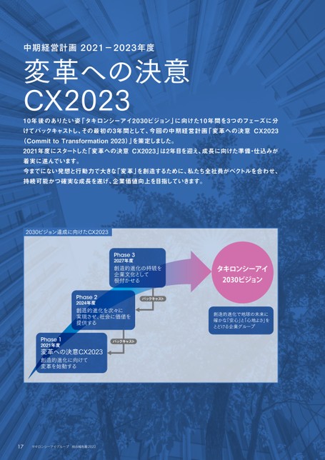 変革への決意CX2023中期経営計画2021-2023年度10年後のありたい姿「タキロンシーアイ2030ビジョン」に向けた10年間を3つのフェーズに分けてバックキャストし、その最初の3年間として、今回の中期経営計画「変革への決意CX2023(CommittoTransformation2023)」を策定しました。2021年度にスタートした「変革への決意CX2023」は2年目を迎え、成長に向けた準備・仕込みが着実に進んでいます。今までにない発想と行動力で大きな「変革」を創造するために、私たち全社員がベクトルを合わせ、持続可能かつ確実な成長を遂げ、企業価値向上を目指していきます。2030ビジョン達成に向けたCX2023タキロンシーアイ2030ビジョンPhase12021年度変革への決意CX2023創造的進化に向けて変革を始動するPhase22024年度創造的進化を次々に実現させ、社会に価値を提供するPhase3創造的進化の持続を企業文化として根付かせる2027年度創造的進化で地球の未来に確かな「安心」と「心地よさ」をとどける企業グループバックキャストバックキャスト17タキロンシーアイグループ統合報告書2022