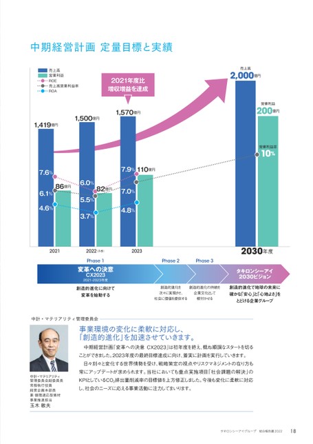 中期経営計画定量目標と実績2,000億円200億円売上高営業利益1,419億円86億円7.6%6.1%4.6%3.7%4.8%5.5%7.0%6.0%7.9%82億円110億円創造的進化に向けて変革を始動する創造的進化を次々に実現させ、社会に価値を提供する創造的進化の持続を企業文化として根付かせる創造的進化で地球の未来に確かな「安心」と「心地よさ」をとどける企業グループ変革への決意タキロンシーアイ2030ビジョンPhase12030年度Phase2Phase3CX20232021-2023年度20212022(予想)202310%営業利益率1,570億円1,500億円売上高営業利益ROE売上高営業利益率ROA2021年度比増収増益を達成中期経営計画「変革への決意CX2023」は初年度を終え、概ね順調なスタートを切ることができました。2023年度の最終目標達成に向け、着実に計画を実行していきます。日々刻々と変化する世界情勢を受け、戦略策定の視点やリスクマネジメントの在り方も常にアップデートが求められます。当社においても重点実施項目「社会課題の解決」のKPIとしているCO2排出量削減率の目標値を上方修正しました。今後も変化に柔軟に対応し、社会のニーズに応える事業活動に注力してまいります。事業環境の変化に柔軟に対応し、「創造的進化」を加速させていきます。中計・マテリアリティ管理委員会中計・マテリアリティ管理委員会副委員長常務執行役員経営企画本部長兼循環適応型素材事業推進担当玉木敏夫18