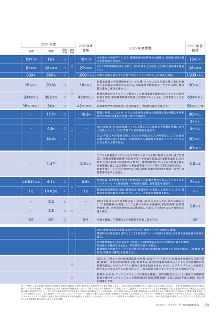 2021年度2022年度目標2022年度課題2023年度目標目標実績個別評価総合評価10件/年16件〇〇10件/年今年度から新条件※1により、環境配慮の該否判定を厳格化。目標値は据え置き目標達成を目指す。15件/年8%削減26%削減〇27%削減2021年度実績集計後に分析し、KPI目標を上方修正。CO2排出量削減を推進する。28%削減300名859名〇1,000人以上今期の活動を強化する方針であることからKPIの上方修正を実施。1,200人以上15%以上20.8%〇△18%以上新製品登録の有効期限切れ(3~5年間)のため、2022年度以降に集計対象外となる製品が増加する見込み。目標達成の難易度が上がるが、KPI目標は据え置きし実行を進める。20%以上20億円以上35百万円×45億円以上新規企画力のスキルアップ教育として新規事業企画創出コンテストの実行計画を策定。新規事業戦略の見直しを実施するとともに、人材育成にも力を入れる。60億円以上35件/年以上34件〇42件/年以上各事業部門で目標設定し必達意識を上げ特許出願を促進する。50件以上/年―17.7%〇△18.6%順調に伸長しているが、さらなる海外売上増大の促進策立案が課題。各事業部門の支援・促進策の立案と実行を目指す。20%以上―――――3%以上―4.6%〇―2021年度は、対2020年度で0.6%上昇し2023年度の中計最終目標に近づく結果となった。2022年度での目標達成を目指す。5%以上―16.4%×―2023年度の中計最終目標とは大きな乖離。新たなKPI項目として「女性総合職の採用比率」を追加し、中途採用の人事戦略も見直すことで、さらなる女性比率の上昇を図る。20%以上―――――40%以上―1.4※5――2.0以上デジタル成熟度スコアは、2022年度から多くの企業が採用するIPA(独立行政法人情報処理推進機構)の診断手法への切替を実施。DX戦略推進部を2021年度10月に新設。DX推進PJを発足し、業務機能別にデジタルの推進を図る体制整備は完了。全工場統一の新生産管理システム導入の実行計画を策定。営業支援ツールを2022年度1Qに導入開始。効果的な活用を検討しながら営業業務の効率化を図る。3.0以上全体5.7%以上6.1%〇△5.5%原材料高、国際情勢不安など営業利益への影響が懸念される。さらなるコストリダクションと販売価格への転嫁を実施し目標達成を目指す。7%以上1社1事業5社×1社関係会社管理制度(規程・評価区分・撤退基準)の見直しを実行する。また、関係会社支援の観点で検討を行い、グループ経営の再整備を図る。ゼロ―2.5△△―2021年度はスコアの変動はなく、改善には至らなかったが、新たな試みとして「多面観察」を実施、スコア上昇の効果を今後期待。有給取得率、長時間労働者0件、男性育休取得率は目標達成しており、引き続きスコア改善の促進を図る。3.0以上―2.8△―0件0件〇0件今期も継続して意識向上の啓蒙策を計画し実行する。0件×2021年度の成長投資額は3,079百万円。投資アイデアの創出に課題。積極的な投資促進を目的とした「本社支援ファンド制度」を実施。引き続き成長投資の促進を図る。△研究開発本部を2022年4月に新設し、研究開発部に加えて知財部を管下に配置。知財面との連携を活性化し、研究開発の強化を図る。開発期間の短縮やアイデア創出等の有効な研究開発費の活用を引き続き検討し、新事業・新製品・新技術の獲得」を推進する。〇2021年10月から「DX戦略推進部」を新設。当社グループ全体のDX推進を包括的な立場で指揮・監督し、全社のDX戦略を企画・推進する。部分的な業務効率化にとどまらず全社横断的な業務高度化に向けたデジタル技術の活用を加速させる。さらに、ビジネスプロセスの変革と新たなビジネスモデルの創出により、一層の競争力強化をもたらすDXを実現させる。〇委員会・分科会・ワーキンググループの体制を構築し、部門横断的なメンバー構成で中期経営計画の進捗モニタリングおよび施策検討を実施(開催実績:12回)。2022年度も原則1回/月の開催を予定。※1:今期からは新定義を「SDGsの達成に貢献する製品」と定め、DR3完了の案件のみを集計対象とする。※2:2021年度実績をもとに修正または新設した項目。※3:管理職相当の職位も含む。※4:リーダー相当職にいる社員とは、社内人事制度(等級制度)において『担う/任された業務・テーマ・課題について、組織メンバーをリードしながら業務遂行する』と定義づけられた等級以上にある総合職(管理職含)をいう。※5:2021年度実績は2022年度から採用の新診断手法による参考値。※6:新設5年以内の事業・事業会社および取締役会にて撤退方針が決議された事業・事業会社については対象外とする。※7:社員ワークエンゲージメントスコア……社員の仕事への活力、熱意、没頭度などを測ることを目的としたアンケート結果を1~4段階でスコア化したもの。※8:社員ロイヤルティスコア……社員の会社に対する満足度や将来の期待などを測ることを目的としたアンケート結果を1~4段階でスコア化したもの。※9:社内定義の「重大なコンプライアンス違反」に該当し、社会影響を鑑み対外公表した違反件数。20