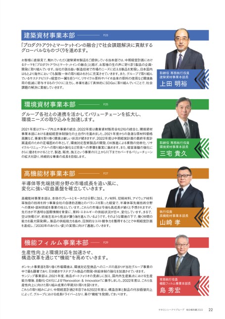 グループ各社との連携を活かしてバリューチェーンを拡大し、環境ニーズの取り込みを加速します。取締役専務執行役員環境資材事業本部長環境資材事業本部三宅貴久P.252021年度はグループ内土木事業の統合、2022年度は農業資材販売会社2社の統合と、環境資材事業本部における連結経営体制強化の土台作りを進めました。2021年度からの急激な原材料価格高騰など、事業を取り巻く環境は厳しい状況が続きますが、2022年度は中期経営計画の最終年度計画達成のための足場固めの年として、環境対応型新製品の開発、DX推進による業務の効率化、リサイクル・リニューアルへの取り組み強化など将来への準備を着実に進めます。また、経営基盤の強化にさらに磨きをかけることで、製造、販売、施工という事業の川上から川下までカバーするバリューチェーンの拡大を図り、持続的な事業の成長を目指します。「プロダクトアウトとマーケットインの融合」で社会課題解決に貢献するグローバルなものづくりを進めます。建築資材事業本部P.23お客様に直接見て、触れていただく建築資材製品をご提供している当本部では、中期経営計画におけるテーマを「プロダクトアウトとマーケットインの融合」と掲げ、お客様の生の声に寄り添う製品の企画・開発に取り組んでいます。当社の誇る高い製造技術で市場のニーズに応える製品を実現し、日本国内はもとより海外においても製販一体の取り組みをさらに充実させていきます。また、グループで取り組んでいるサステナビリティ経営の一翼を担うべく、リサイクル原料やバイオ由来の原料の使用など環境負荷の低減に寄与するものづくりに注力し、本業を通じて具体的にSDGsに取り組んでいくことで、社会課題の解決に貢献していきます。取締役専務執行役員建築資材事業本部長上田明裕半導体等先端技術分野の市場成長を追い風に、変化に強い収益基盤を確立していきます。高機能材事業本部P.27高機能材事業本部は、本体のプレートとモータの2分野に加え、ナノ材料、切削材料、アイウェア材料等独自の技術を持つ事業会社の自律的活動とのバランスを取った経営で、半導体等先端技術分野への素材・部材供給を事業の柱としています。これらの市場は今後も高成長が続くと予想されますが、先行きが不透明な国際情勢を背景に、原料・エネルギーの供給状況が日々、変化しています。まるで、空は快晴だが、前後左右から荒波が襲う海を進んでいるようです。そのような環境の下で、働く仲間の能力を最大限発揮し、製品の供給能力を高め、圧倒的なコスト競争力を獲得することで中期経営計画を達成し、「2030年のありたい姿」の実現に向けて邁進していきます。執行役員高機能材事業本部長山崎孝生産性向上と環境対応を加速させ、構造改革を通じて“機能”を高めていきます。機能フィルム事業本部P.29ボンセット事業部を取り巻く市場環境は、環境対応型商品へのニーズの高まりが当社グループ事業の中で最も顕著であり、引き続きサステナブル商品の開発・供給体制の強化を加速させていきます。サンジップ事業部は、2021年度、商品ポートフォリオの見直しに加え、国内外生産拠点における生産能力増強、自動化・DX化による“Renovation&Innovation”に着手しました。2022年度は、これら生産性向上に向けた取り組み成果の早期刈り取りを図ります。これらの取り組みにより、中期経営計画2年目である2022年度は、構造改革と製品の付加価値向上によって、グループにおける成長ドライバーとなり、真の“機能”を発揮してまいります。常務執行役員機能フィルム事業本部長島秀宏22