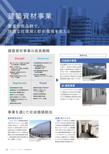 建築資材事業の成長戦略事業を通じた社会価値創出住宅建築に欠かすことのできない雨どい・排水ます等の水処理製品や、脱炭素社会に貢献するポリカーボネート樹脂製高断熱中空パネル「ルメウォール」など、住宅から非住宅で使用される住設建材製品を幅広く扱っています。住設建材事業プールサイドやマンションの廊下、階段などの安全を守る優れた防滑性能を有する床材と、インテリアや建築物の意匠性を高める化粧フィルムを扱っています。床・建装事業事業内容●ポリカーボネートの成形・加工技術および国内随一の製造能力●長期優良住宅の増加●建築物省エネ法適用範囲の拡大●生活様式・価値観の変化●国内人口の少子高齢化●海外未開拓エリアへの拡大●新興国の生活水準向上による需要拡大●畜舎特例法の施行●新設住宅着工戸数の減少●国内人口減少によるマーケットの縮小●急激な気象環境変化●原材料価格の高騰●海洋プラスチック問題●海外生産拠点(BLX)によるグローバル展開●高シェアを有するポリカーボネート建材、住宅資材、防滑性塩ビ床材●建装材へ機能性を付与する総合的開発力●住設建材製品の海外販売チャネル●当社の床・建装事業は総合的なインテリアメーカーではない●床・建装事業は、大手競合先と比較して事業規模が小さい●床・建装事業の限定的な海外拠点展開StrengthOpportunityWeaknessThreatポリカーボネート樹脂板防滑性ビニル床シート脱炭素社会作り抗菌・抗ウイルスポリカーボネート樹脂製高断熱中空パネル「ルメウォール」は、樹脂の特長、当社グループの加工技術を活かして、自然光を取り入れながら開口部からの熱損失を抑制し、照明・空調のエネルギー負荷を効果的に抑える低炭素建築を実現し、地球温暖化対策、脱炭素社会作りに貢献していきます。店舗、オフィス向けなどに展開するデザイン性、耐久・耐水性に優れた内装材である粘着剤付き不燃化粧フィルム「ベルビアン」。消臭機能があり、汚れがつきにくく除去しやすいトイレ・屋内施設用防滑性ビニル床シート「ネオクリーン」。これらは、新たに付与した抗菌・抗ウイルス性能によってウイルスを99%以上低減し、衛生的な空間作りを提供します。ポリカーボネート樹脂製高断熱中空パネル「ルメウォール」施工例ネオクリーン施工例豊富な商品群で、快適な住環境と都市環境を支える建築資材事業23