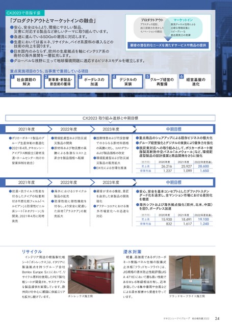 ●重点商品のシェアアップによる既存ビジネスの極大化●グループ経営強化とデジタルの実装により競争力を強化●ポリカーボネート製品のグループ生産体制の最適化●2021年4月、タキロンシーアイプラス㈱設立(建材流通・ホームセンター向けの営業体制を統合)●環境配慮型および防災減災製品の開発●原材料および物流費の高騰による急激なコスト上昇分を製品価格へ転嫁●国際情勢および円安影響でのさらなる原材料価格の高騰に対し、コストダウンおよび製品価格の改定●環境配慮型および防災減災製品の販売拡大●DX化による合理化推進●脱炭素対応への取り組みとして、ポリカーボネート樹脂製高断熱中空パネル「ルメウォール」など、環境配慮型製品の設計提案と商品開発をさらに強化(百万円)売上高営業利益2020年度26,2162021年度25,9272022年度見通し28,6001,2371,0991,650(百万円)売上高営業利益2020年度15,9302021年度18,4912022年度見通し19,1008321,6171,240中期目標2021年度2022年度2023年度●抗菌・抗ウイルス性能を付与したタイプの粘着剤付き不燃化粧フィルム「ベルビアン」と防滑性ビニル床シート「ネオクリーン」を開発、2021年4月に同時発売●海外におけるリサイクル製品の拡充●防滑性能に弾性機能を付与し、より安全に配慮した床材「プラスケア」の販売拡大●顧客が求める機能、意匠を追求した新製品の開発強化●アフターコロナにおける海外市場変化への迅速な対応●安心、安全を基本コンセプトとしたデファクトスタンダード化を追求し、全マンション市場における差別化を徹底●海外シフトおよび海外拠点強化(欧州、北米、中国)を図り、ボーダレス加速中期目標2021年度2022年度2023年度CX2023取り組み進捗と中期目標リサイクル浸水対策インテリア用途の樹脂製化粧シート「ボンレックス」は、イタリアに製造拠点を持つグループ会社BonlexEuropeS.r.l.において、リサイクル原料を使用したPET製化粧シートが開発され、サステナブルな製品提供を実現しています。欧州向けを中心に順調に供給エリアも拡大し続けています。軽量、高強度であるポリカーボネート樹脂パネル仕様の脱着式止水板「フラッドセーフライト」は、JIS規格の浸水防止性能評価(JISA4716)において最も高い性能であるWs-6等級相当を有し、近年多発している集中豪雨や台風などによる浸水被害から資産を守っています。CX2023で目指す姿重点実施項目のうち、当事業で重視している項目「プロダクトアウトとマーケットインの融合」●心、安全はもとより、環境にやさしい製品、災害に対応する製品など新しいテーマに取り組んでいます。●速に進んでいるSDGsの潮流に対応します。●産においては省エネ、リサイクル、バイオ系原料の導入などの技術の向上を図ります。●本国内のみならず、欧州の生産拠点を軸にインテリア系の商材の海外展開を一層拡充します。●ローバルな視野に立って地球環境問題に適応するビジネスモデルを確立します。56社会課題の解決新事業・新製品・新技術の獲得ボーダレスの加速デジタルの実装グループ経営の再整備経営基盤の進化4321ボンレックス施工例フラッドセーフライト施工例顧客の潜在的なニーズを満たすサービスや商品の提供プロダクトアウトプラスチック成形、加工技術力を活かしたイノベーションの創出マーケットイン販売チャネル活用による正確な情報収集とスピーディーな商品開発力の発揮24