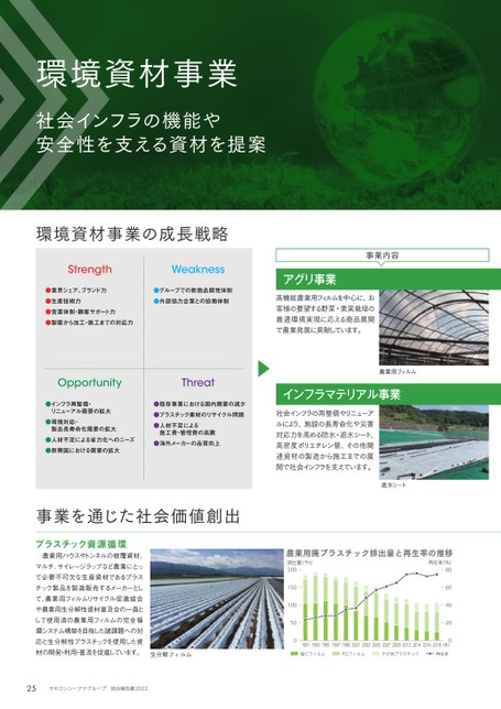 環境資材事業の成長戦略事業を通じた社会価値創出高機能農業用フィルムを中心に、お客様の要望する野菜・果実栽培の最適環境実現に応える商品展開で農業発展に貢献しています。アグリ事業社会インフラの再整備やリニューアルにより、施設の長寿命化や災害対応力を高める防水・遮水シート、高密度ポリエチレン管、その他関連資材の製造から施工までの展開で社会インフラを支えています。インフラマテリアル事業事業内容●インフラ再整備・リニューアル需要の拡大●環境対応・製品長寿命化需要の拡大●人材不足による省力化へのニーズ●新興国における需要の拡大●既存事業における国内需要の減少●プラスチック素材のリサイクル問題●人材不足による施工費・管理費の高騰●海外メーカーの品質向上●業界シェア、ブランド力●生産技術力●営業体制・顧客サポート力●製販から加工・施工までの対応力●グループでの新商品開発体制●外部協力企業との協働体制農業用フィルム遮水シートプラスチック資源循環農業用ハウスやトンネルの被覆資材、マルチ、サイレージラップなど農業にとって必要不可欠な生産資材であるプラスチック製品を製造販売するメーカーとして、農業用フィルムリサイクル促進協会や農業用生分解性資材普及会の一員として使用済の農業用フィルムの完全循環システム構築を目指した諸課題への対応と生分解性プラスチックを使用した資材の開発・利用・普及を促進しています。生分解フィルム社会インフラの機能や安全性を支える資材を提案環境資材事業02040608005010015020019911993199519971999200120032005200720092012201420162018(年)再生率(%)排出量(千t)塩ビフィルムPOフィルムその他プラスチック再生率農業用廃プラスチック排出量と再生率の推移25