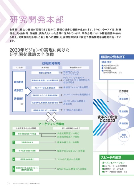 お客様に役立つ機能が発現できて初めて、技術の進歩に価値が生まれます。タキロンシーアイは、耐擦傷性、光・熱制御、伸縮性、高耐久といった分野に注力しています。既存分野における顧客価値のさらなる向上、発現機能を活用した新分野への展開、社会課題の解決に役立つ技術開発を積極的に行っています。研究開発本部変革への決意CX2023既存領域包装用フィルムのモノマテリアル化伸縮性フィルムの用途展開フィルム・シートの表面機能化モビリティ部材の軽量化・高意匠化ナノ材料の高分散化リデュース・リサイクル・バイオマス・生分解性材料の有効活用化気候変動問題への対応健康で安心な暮らしへの貢献スマート化社会への貢献CASE・MaaS、軽量化への貢献建築資材環境資材高機能材機能フィルム技術開発戦略マーケティング戦略材料配合成形加工評価技術多層化、延伸技術異種材分離、相溶化、生分解評価技術エラストマー配合、多層化技術塗料設計、コーティング、表面加飾技術高品質押出、表面加飾、繊維複合技術特殊表面処理、スラリー分散技術コア技術要素技術新規製品分野資源循環促進への貢献産業の省力化への貢献持続可能な社会への適応労働人口の減少少子高齢化社会の進展住宅建材の知能化自動車のEV化、自動車・ドローン・建機の自動運転市場環境変化・社会課題新たな価値創出の視点オープンイノベーション●エンドユーザーとの共同開発●原材料メーカーとの協業●グループ会社との協業などスピードの追求12345など財務投資●外部専門家の活用●外部技術の導入●試験設備、分析装置の充実など積極的な資本投下2030年ビジョンの実現に向けた研究開発戦略の全体像31
