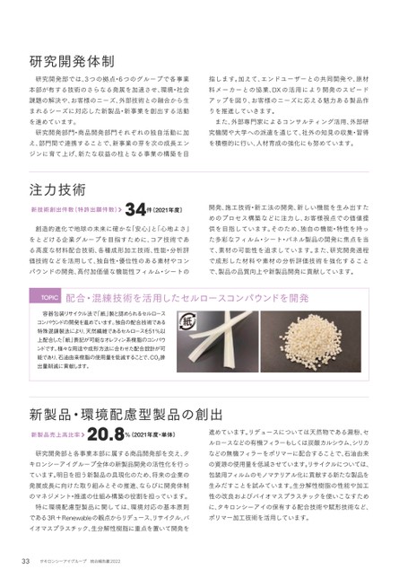 研究開発体制研究開発部では、3つの拠点・6つのグループで各事業本部が有する技術のさらなる発展を加速させ、環境・社会課題の解決や、お客様のニーズ、外部技術との融合から生まれるシーズに対応した新製品・新事業を創出する活動を進めています。研究開発部門・商品開発部門それぞれの独自活動に加え、部門間で連携することで、新事業の芽を次の成長エンジンに育て上げ、新たな収益の柱となる事業の構築を目指します。加えて、エンドユーザーとの共同開発や、原材料メーカーとの協業、DXの活用により開発のスピードアップを図り、お客様のニーズに応える魅力ある製品作りを推進していきます。また、外部専門家によるコンサルティング活用、外部研究機関や大学への派遣を通じて、社外の知見の収集・習得を積極的に行い、人材育成の強化にも努めています。注力技術創造的進化で地球の未来に確かな「安心」と「心地よさ」をとどける企業グループを目指すために、コア技術である高度な材料配合技術、各種成形加工技術、性能・分析評価技術などを活用して、独自性・優位性のある素材やコンパウンドの開発、高付加価値な機能性フィルム・シートの開発、施工技術・新工法の開発、新しい機能を生み出すためのプロセス構築などに注力し、お客様視点での価値提供を目指しています。そのため、独自の機能・特性を持った多彩なフィルム・シート・パネル製品の開発に焦点を当て、素材の可能性を追求しています。また、研究開発過程で成形した材料や素材の分析評価技術を強化することで、製品の品質向上や新製品開発に貢献しています。新製品・環境配慮型製品の創出研究開発部と各事業本部に属する商品開発部を交え、タキロンシーアイグループ全体の新製品開発の活性化を行っています。明日を担う新製品の具現化のため、将来の企業の発展成長に向けた取り組みとその推進、ならびに開発体制のマネジメント・推進の仕組み構築の役割を担っています。特に環境配慮型製品に関しては、環境対応の基本原則である3R+Renewableの観点からリデュース、リサイクル、バイオマスプラスチック、生分解性樹脂に重点を置いて開発を進めています。リデュースについては天然物である澱粉、セルロースなどの有機フィラーもしくは炭酸カルシウム、シリカなどの無機フィラーをポリマーに配合することで、石油由来の資源の使用量を低減させています。リサイクルについては、包装用フィルムのモノマテリアル化に貢献する新たな製品を生みだすことを試みています。生分解性樹脂の性能や加工性の改良およびバイオマスプラスチックを使いこなすために、タキロンシーアイの保有する配合技術や賦形技術など、ポリマー加工技術を活用しています。新技術創出件数(特許出願件数)34件(2021年度)容器包装リサイクル法で「紙」製と認められるセルロースコンパウンドの開発を進めています。独自の配合技術である特殊混錬製法により、天然繊維であるセルロースを51%以上配合した「紙」表記が可能なオレフィン系樹脂のコンパウンドです。様々な用途や成形方法に合わせた配合設計が可能であり、石油由来樹脂の使用量を低減することで、CO2排出量削減に貢献します。配合・混練技術を活用したセルロースコンパウンドを開発TOPIC新製品売上高比率20.8%(2021年度・単体)33タキロンシーアイグループ統合報告書2022