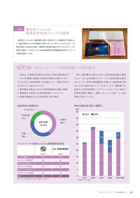 梱包用フィルムとは、宅配用梱包資材に使用されている緩衝材の代替品として、商品を固定するための伸縮性に優れたオレフィン系フィルムのことです。この梱包形態は、従来品と比較して緩衝材の総量を削減できることからポリマーごみ削減に貢献していますが、さらに石油由来樹脂の使用量低減を目指したグレードの開発を進めています。梱包用フィルムの環境負荷低減グレードを開発TOPICタキロンシーアイの知的財産への取り組み当社は、中期経営計画「CX2023」の重点実施項目の一つに「新事業・新製品・新技術の獲得」を掲げており、それを支える知的財産への投資について基本方針を以下のように定めています。1.競争優位の確立に向けた知的財産創出活動の実践2.事業遂行を担保する知的財産権クリアランス3.事業の推進を支える知的財産人材の育成特に、競争優位の確立に向けた知的財産活動の実践においては、当社事業をサポートする知的財産の創出はもとより、将来の事業展開を見据えた知的財産の創出にも引き続き注力していきます。また、事業遂行を担保する知的財産権クリアランスにおいては、他社の知的財産権を尊重し、侵害しないことを第一に、安全実施に努めています。全613件2021年度実施中防衛将来実施その他0%39%1%%0201201201920211052015302503550国内(件)年度552920201011025362125国際※「国際」はPCT出願ハウスマークの海外における商標権取得状況登録済登録済アジア(亜州)1516ヨーロッパ(欧州)※66アフリカ(阿州)22北アメリカ(北米)22南アメリカ(南米)22オセアニア(大洋州)22合計2930※ヨーロッパ(欧州)はEUTM(27か国)を1とカウント保有特許の実施状況特許出願件数(国内/国際※)34