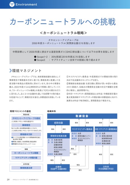 カーボンニュートラルへの挑戦環境マネジメントタキロンシーアイグループでは、地球環境保護を目的として環境理念や環境基本方針に基づき、環境負荷に配慮した生産活動や新商品の開発等に努めています。世の中の情勢を鑑み、2022年度からは企業使命をより明確に果たしていくため、カーボンニュートラル戦略」の発表とTCFDの開示を行うに至りました。主に3つの会議体を通して各部署での取り組みを促進することで、環境対応を強化し目標達成を目指していきます。①サステナビリティ委員会:中長期視点での環境対策の取り決めや各会議体のモニタリングを担う。②環境保全推進会議:生産活動に関係が深い本部から選出された委員が、各拠点の環境保全活動の状況や課題を定期的に報告し、進捗管理する。③中計・マテリアリティ管理委員会と分科会:中期経営計画の重点実施項目やマテリアリティ中期計画の目標達成に向けた施策を分科会で毎月検討し、管理委員会で報告する。<カーボンニュートラル戦略>タキロンシーアイグループは2050年度カーボンニュートラル(実質排出量0)を目指します中間目標として2030年度に排出する温室効果ガス(GHG)排出量について以下の水準を目指します●Scope1・2:35%削減(2018年度比)を目指します●Scope3:サプライチェーン全体での削減に取り組みます環境マネジメントの基柱タキロンシーアイグループの使命カーボンニュートラル戦略マテリアリティ中期計画環境関連法律人と地球にやさしい未来を創造する環境理念私たちは常に地球環境保護をこころがけ、人と地球と未来にやさしいものづくりをめざします。環境基本方針❶すべての企業活動における環境負荷低減と脱炭素の推進❷環境に配慮した技術開発と製品提供❸積極的な社会とのコミュニケーション理念体系戦略法令対応組織体系提言報告取締役会経営会議環境保全推進会議会議体(各部門・会議体制)分科会(社会課題分科会)サステナビリティ委員会中計・マテリアリティ管理委員会提言提言報告報告提言報告提言報告提言報告提言報告委員長委員事務局社長経営会議メンバーサステナビリティ戦略部議長委員事務局生産本部長生産企画部設備技術部経営企画部サステナビリティ戦略部生産企画部委員長委員事務局社長経営企画本部経営管理本部各事業本部経営企画部39タキロンシーアイグループ統合報告書2022