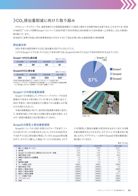 CO2排出量削減に向けた取り組みタキロンシーアイグループは、温室効果ガスの長期削減目標がパリ協定に整合する持続可能な企業であることを示すため、従来のWB2℃※に沿った目標(Scope1・2について2030年度で2018年度比30%削減)から35%削減へ上方修正し、CO2の削減に取り組んでいます。※WB2℃:世界の気温上昇を産業革命前より2℃を十分に下回る水準に抑える温室効果ガス削減目標排出量分析2021年度の温室効果ガス(CO2)排出量は625千(t-CO2)でした。このうちScope1・2では81千(t-CO2)で全体の約13%、Scope3は544千(t-CO2)で全体の約87%を占めています。Scope1・2Scope1Scope2Scope313%87%Scope1・2のCO₂排出量単位:(千t-CO₂)※2018年度2019年度2020年度2021年度109898381Scope3のCO₂排出量単位:(千t-CO₂)2018年度2019年度2020年度2021年度261244223544※2021年度は算出対象をグループ全体、かつカテゴリー1~15全体へ拡大※タキロンシーアイグループの原単位のCO2排出量については、前年度比1%削減を目標として取り組んできており、非財務データ(P.68)に掲載しています。Scope1・2の排出量削減策Scope1・2の削減として、タキロンシーアイグループの各生産拠点で従来から取り組んでいる「省エネ」活動に加えて、2021年度は一部の生産拠点で太陽光パネル設置による「創エネ」を取り入れました。今後は目標達成に向けて、抜本的な削減策の検討と並行して、従来取り組んできた省エネ活動の更なる強化を図り、エネルギー使用の最適化に向け取り組んでいきます。Scope3の算定と排出量削減策Scope3については、2021年度からグループ全体で、1~15の全カテゴリーに対象を拡大しました。そのため2020年比で320千(t-CO2)排出量が増加しています。Scope3排出量の中で、カテゴリ1(購入した製品・サービス)が約59%、カテゴリ12(販売した製品の廃棄)が約25%を占めています。引き続き算出精度を向上させながら、カテゴリ1と12を重点的に削減しながら、サプライチェーン全体でScope3の排出量削減に取り組んでいきます。安冨工場単位:千t-CO2カテゴリ2019年度2020年度2021年度1購入した製品・サービス177.0178.0318.72資本財24.08.014.73Scope1・2に含まれない燃料およびエネルギー活動13.013.017.24輸送・配送(上流)25.022.038.55事業から排出される廃棄物1.02.02.06出張3.01.03.07雇用者の通勤0.40.41.08リース資産(上流)対象外対象外対象外9輸送・配送(下流)(未算定)(未算定)4.010販売した製品の加工(未算定)(未算定)対象外11販売した製品の使用(未算定)(未算定)8.012販売した製品の廃棄(未算定)(未算定)137.713リース資産(下流)(未算定)(未算定)対象外14フランチャイズ(未算定)(未算定)対象外15投資(未算定)(未算定)対象外40