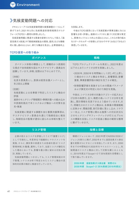 気候変動問題への対応タキロンシーアイは気候変動問題を重要課題の一つとして挙げており、2021年5月に気候関連財務情報開示タスクフォース(TCFD)へ賛同を表明しました。気候変動問題に関連する事象を経営リスクとして捉え、温室効果ガス削減」や「環境貢献製品の開発、提供」などを積極的に推し進めるとともに、新たな機会を見出し、企業価値向上を目指します。今後はTCFD提言に沿って気候変動が事業活動に与える影響を分析・評価し、複数のシナリオに基づく対応策を策定し、事業のレジリエンス向上を図るとともに、これらの取り組みをステークホルダーの皆様により分かりやすくお伝えできるよう発信していきます。TCFD提言への取り組みガバナンス戦略ガバナンス体制の構築として、俯瞰的かつ長期的な視点で全体統制を図るサステナビリティ委員会を設置しています。体制、役割は以下のとおりです。(体制)社長を委員長とし、委員は経営会議メンバーとし、年2回以上開催(役割)気候変動による各事業で特定したリスクと機会の評価進捗のモニタリング情報開示・事業計画への組み込み中長期的視点で本リスクおよび機会への対策を拡充・推進気候変動に関連する課題を含む重要決議事項は、サステナビリティ委員会を通じて取締役会に報告し、取締役会の監督が適切に図られる体制を整えています。TCFDプロジェクトチームを発足し、2022年度は以下のとおりシナリオ分析を実施しました。・030年、2050年を時間軸とし1.5℃、4℃上昇した場合のリスクと機会を特定し、影響要因、影響要素、事業影響評価の検討を完了させ確定。・務影響評価を実施するための関連パラメータおよび算定式の特定に向けた検討を実施。今後は、シナリオ分析の対象カテゴリーの拡大および分析の高度化、且つ、精度の高いシナリオ分析を実施し、開示情報を充実できるよう進めていきます。また、明確化されたリスクと機会は、各事業の環境戦略に反映させ、環境目標、実行計画に落とし込み、リテラシー向上、リスク管理に関わる施策への対応状況などのモニタリングやフィードバックが行えるプロセスの構築を目指しリスクの低減と機会の確実な獲得に繋げていきます。リスク管理指標と目標企業の抱えるリスクを評価したうえで「重要リスク」として可視化し、年度単位で組織的にマネジメントを実施、さらに、損失等の回避または低減を図る「リスク管理体制」を整備、運用しており、当該リスクが顕在化した場合においても、影響を最小限に留める対処を検討、実施しています。気候変動問題につきましても、リスク管理体制の中で管理、シナリオ分析で特定されたリスクと機会の具体的対応策の検討と推進を行っています。環境ビジョンにおいて、2022年度「CN2050/2030ビジョン」を新たに掲げ、2050年までに温室効果ガス排出量を実質ゼロにすることを目指しています。また、2050年までの中間地点の2030年をマイルストーンとし、気候関連のリスクと機会に対して対策を講じるとともに、2018年度比でScope1・2で35%削減を目標値として取り組んでいきます。2050年度室効果ガス排出量実質ゼロ2030年度cope1・2:35%削減(2018年度比)41タキロンシーアイグループ統合報告書2022
