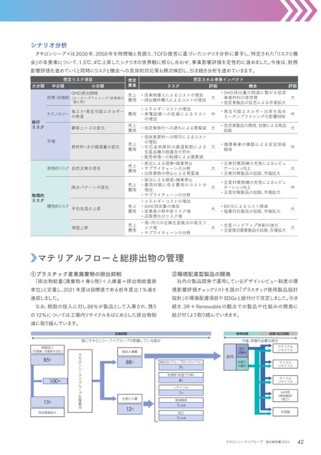 シナリオ分析タキロンシーアイは2030年、2050年を時間軸と見据え、TCFD提言に基づいたシナリオ分析に着手し、特定された「リスクと機会」の各要素について、1.5℃、4℃上昇したシナリオの世界観に照らし合わせ、事業影響評価を定性的に進めました。今後は、財務影響評価を進めていくと同時にリスクと機会への具体的対応策も順次検討し、引き続き分析を進めていきます。想定リスク項目想定要素想定される事業インパクト大分類中分類小分類リスク評価機会評価移行リスク政策・法規制GHG排出価格(ーボンプライシング・炭素税の導入等)売上費用・素税導入によるコストの増加・出権枠購入によるコストの増加大・HG排出量の削減に繋がる低炭素原材料の使用増・炭素製品の拡充による市場拡大大テクノロジー省エネ・再生可能エネルギーの発達費用・ネルギーコストの増加・電設備への投資によるコストの増加中・生可能エネルギー比率を高めカーボンプライシングの影響排除中市場顧客ニーズの変化売上費用・炭素移行への遅れによる需要減大・炭素製品の開発、切替による商品拡販大原材料・水の調達量の変化売上費用・炭素原料への移行によるコストの増加・石由来原料の調達制限による生産品種の統廃合の恐れ・売単価への転嫁による需要減大・環事業の構築による安定供給確保中物理的リスク急性的リスク自然災害の発生売上費用・災による損害・操業停止・プライチェーンの分断・荷業務の停止による需要減大・害対策訓練の充実によるレピュテーション向上・害対策製品の拡販、市場拡大大慢性的リスク降水パターンの変化売上費用・災による損害・操業停止・雨対策に係る費用のコストの増加・プライチェーンの分断大・害対策訓練の充実によるレピュテーション向上・害対策製品の拡販、市場拡大中平均気温の上昇売上費用・ネルギーコストの増加・HG排出量の増加・業員の熱中症リスク増・質悪化のリスク増大・X化によるコスト削減・暑対応製品の拡販、市場拡大大海面上昇売上費用・・河川の近隣生産拠点の被災リスク増・プライチェーンの分断大・産バックアップ体制の強化・害復旧需要製品の拡販、市場拡大大マテリアルフローと総排出物の管理①プラスチック産業廃棄物の排出抑制「排出物総量(廃棄物+専ら物)÷入庫量=排出物総量原単位」と定義し、2021年度は目標値である前年度比1%減を達成しました。なお、樹脂の投入に対し88%が製品として入庫され、残りの12%については工場内リサイクルをはじめとした排出物削減に取り組んでいます。②環境配慮型製品の開発社内の製品開発で運用しているデザインレビュー制度の環境影響評価チェックリストを国の「プラスチック使用製品設計指針」の環境配慮項目やSDGsと紐付けて改定しました。引き続き、3R+Renewableの観点での製品や仕組みの開発に結び付くよう取り組んでいきます。生産段階使用段階処理・処分段階%100%1%%12%%4%1%1%未満1%未満樹脂投入(可塑剤、充填剤を含む)再生樹脂投入製品入庫量使用耐久消費材非耐久消費材マテリアルリサイクルケミカルリサイクルサーマルリサイクル未利用(単純焼却)(埋立)未把握生産ロス量再生材(グループ内リサイクル)有価物(有価で引取)リサイクル単純焼却埋立既にタキロンシーアイグループが把握している部分今後、把握が必要な部分タキロンシーアイグループ生産拠点42