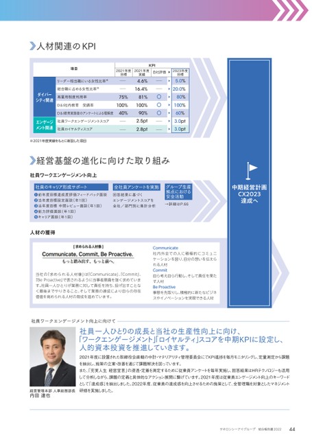 ダイバーシティ関連エンゲージメント関連リーダー相当職にいる女性比率※総合職に占める女性比率※再雇用制度利用率D&I教育実施後のアンケートによる理解度D&I社内教育受講率社員ワークエンゲージメントスコア社員ロイヤルティスコア項目KPI2021年度目標2021年度実績自社評価2023年度目標75%4.6%5.0%16.4%20.0%81%80%100%60%100%90%2.5pt3.0pt3.0pt2.8pt100%40%※2021年度実績をもとに新設した項目人材関連のKPI経営基盤の進化に向けた取り組み中期経営計画CX2023達成へ社員ワークエンゲージメント向上❶前年度目標達成度評価フィードバック面談❷当年度目標設定面談(年1回)❸当年度目標中間レビュー面談(年1回)❹能力評価面談(年1回)❺キャリア面談(年1回)社員のキャリア形成サポート回答結果に基づくエンゲージメントスコアを全社/部門別に集計分析全社員アンケートを実施→詳細はP.66グループ生産拠点における安全活動人材の獲得Communicate社内外全ての人に積極的にコミュニケーションを図り、自分の想いを伝えられる人材Commit自ら考え自ら行動し、そして責任を果たす人材BeProactive事態を先取りし、積極的に新たなビジネスやイノベーションを実現できる人材当社の「求められる人材像」は「Communicate」、Commit」、「BeProactive」で表されるように当事者意識を強く求めています。社員一人ひとりが業務に対して責任を持ち、投げ出すことなく最後までやりきること、そして業務の達成により自らの存在価値を高められる人材の育成を進めています。2021年度に設置された取締役会直轄の中計・マテリアリティ管理委員会にてKPI進捗を毎月モニタリングし、定量測定から課題を抽出し、施策の立案・改善を通じて課題解決を図っています。また、充実人生経営宣言」の浸透・定着を測定するために従業員アンケートを毎年実施し、回答結果はHRテクノロジーも活用して分析しながら、課題の定義と具体的なアクション展開に繋げています。2021年度は従業員エンゲージメント向上のキーワードとして「達成感」を抽出しました。2022年度、従業員の達成感を向上させるための施策として、全管理職を対象としたマネジメント研修を実施しました。社員一人ひとりの成長と当社の生産性向上に向け、「ワークエンゲージメント」「ロイヤルティ」スコアを中期KPIに設定し、人的資本投資を推進していきます。経営管理本部人事総務部長内田達也社員ワークエンゲージメント向上に向けて44
