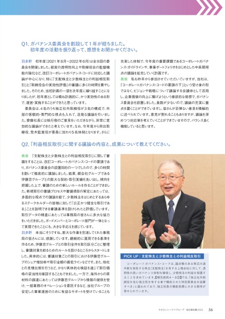 Q1.バナンス委員会を創設して1年が経ちました。初年度の活動を振り返って、感想をお聞かせください。羽多野初年度(2021年8月~2022年6月)は全9回の委員会を開催しました。経営の透明性向上や取締役会の監督機能の強化など、改訂コーポレートガバナンス・コードに対応した議論が中心になり、特に「支配株主と少数株主との利益相反取引」と「取締役会の実効性評価」の審議に多くの時間を費やしました。そのため、当初計画の一部を次年度に繰り越すことになりましたが、初年度としては概ね計画的に、かつ実効性のある形で、運営・実施することができたと思っています。委員会は、4名のうち独立社外取締役が3名の構成で、外部の客観的・専門的な視点も入れて、活発な議論を行いました。齋藤社長には執行側のご意見をいただきながら、非常に実効的な議論ができたと考えています。なお、今年度から貝出取締役、荒木監査役が委員に加わり5名体制となります。さらに充実した体制で、今年度の重要課題であるコーポレートガバナンス・ガイドラインや、事業ポートフォリオをはじめとした中長期視点の議論を拡充していく計画です。高坂私も昨年から参加させていただいていますが、当社は、「コーポレートガバナンス・コードの要請の下」という受け身の形ではなく、ビジョンや戦略について議論する会議体として活用し、企業価値の向上に繋げようという意欲的な発想で、ガバナンス委員会を設置しました。員数が少ないので、議論の充実に重点を置くことができていますし、皆さんが忌憚ない意見を積極的に述べられています。意見が割れることもありますが、議論を深めつつ対応策を考えていくことができていますので、バランス良く機能していると思います。Q2.利益相反取引」に関する議論の内容と、成果について教えてください。高坂「支配株主と少数株主との利益相反取引」に関して審議をすることは、改訂コーポレートガバナンス・コードの要請であり、ガバナンス委員会の設置目的の一つでしたので、多くの時間を割いて徹底的に議論しました。結果、親会社グループである伊藤忠グループとの膨大な契約・取引実績を洗い出し、傾向を把握した上で、審議のための新しいルールを作ることができました。新規取引の審議プロセスや審議項目の策定にあたっては、多面的な視点での議論を経て、少数株主をはじめとするあらゆるステークホルダーの皆様に対して「公正かつ健全な取引である」ことを説明できる審議基準を設けられたと評価しています。取引データの精査にあたっては事務局の皆さんに多大な協力をいただきました。ボードメンバーとコーポレート部門が一体となって実現できたことにも、大きな手応えを感じています。羽多野本当にそうですね。膨大な作業を完遂してくれた事務局の皆さんには、感謝しています。継続的に運用できる基準を作るため、伊藤忠グループとの取引全件を取引区分ごとに整理し、審議対象を絞るためのルールを設けるところからスタートしました。具体的には、審議対象ごとの取引における伊藤忠グループのシェア増加率や取引金額の最低ラインなどです。また、他社との見積比較を行うなど、かなり具体的な検証を通じて取引価格の妥当性を確認することもできました。一方で、海外からの原材料の調達にあたっては伊藤忠グループから情報の提供を受け、一部業務のオペレーションを委託するなど、当社グループの安定した事業運営のために有益なサポートを受けていることもPICKUP|支配株主と少数株主との利益相反取引コーポレートガバナンス・コードは、議決権のある株式の過半数を保有する株主(支配株主)を有する上場会社に対して、透明性の高いガバナンス体制を確保し、少数株主の利益を保護することを求めています。補充原則4-8③】では、独立社外取締役を含む独立性を有する者で構成された特別委員会を設置すべき」と謳われており、独立役員の機能発揮に大きな期待が寄せられています。56