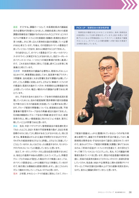 高坂そうですね。課題の一つとして、中長期的視点の議論拡充の必要性が浮き彫りになりました。持続的成長に向けた経営課題を取締役会で議論するのはもちろんのことですが、ビジネスモデルや事業ポートフォリオを客観的・俯瞰的・長期的な視点で見つめ直し、さらに突っ込んだ具体的な論点を提議していく必要があると考えています。今後は、その役割をガバナンス委員会で担っていこうという方針を、皆さんと確認することができました。その皮切りとして、ガバナンス委員会で「コーポレートガバナンス・ガイドライン」を策定することが決まりました。改訂コーポレートガバナンス・コードは、一つひとつの検討事項が非常に奥深いので、これを当社の現状に照らして定義し直すことは非常に有意義だと考えています。羽多野中長期視点の議論の必要性は、高坂さんのおっしゃるとおりです。事業環境は激変しており、脱炭素や廃プラスチック問題等、当社経営に大きな影響を及ぼす課題が山積しています。こうした課題に対処しながら、どのように事業ポートフォリオの最適化・高度化を進めていくのか、中長期的な企業価値の向上を図っていくのか、幅広い観点からの議論が必要であると考えています。また、子会社を含めた当社グループ全体の持続的成長を実現していくためには、攻めの経営施策「既存事業の高付加価値化や新たなビジネスの創造等」を加速していく必要があると思います。グループ経営の再整備については、経営統合以降、不採算事業の整理やグループ会社の再編・統合を進めてきました。引き続き機動的にグループ会社の再編・統合を行うなど、経営効率の向上、新しい価値創造に向けたビジョンを描き、実行に移していくことが肝要であると思います。貝出先日、中計・マテリアリティ管理委員会の報告書を見せてもらったところ、2021年度の不採算事業の数が、2023年度目標のゼロに対して少し開きがあることが分かりました。特に日本では、事業撤退はすんなりと進まず時間がかかるものですが、それぞれの経営状態をどのように評価し、どのように改善していこうとしているのか、もしくはどうなったら撤退するのか、モニタリングのプロセスについてよく確認していきたいと思います。加えて、オーガニックグロースを上回る成長を実現するためには、他社との連携やM&Aも視野に入れていくでしょう。伊藤忠グループとのM&Aが発生した場合のリスク精査にあたっては、ガバナンス委員会もしっかりと機能するよう準備をしていきますので、執行側にも積極的な提案を期待しますし、逆にこちらからそういう働きかけをしていってもよいのではと思います。荒木2年間、タキロンシーアイの経営に関与してみて、グループ経営の基盤はしっかりと整備されているなというのが私の率直な感想です。連結での予算管理の手法が確立しており、権限規程は関係会社・子会社を含めて適切に設定されていますので。皆さんが「グループ経営の再整備」を課題に挙げておられるのは、将来の収益ポートフォリオを見据えて、次の芽をどうやって育てていくか」ということでしょうし、私も、そこの議論の解像度を高めていくべきと思います。現在の収益基盤の確保を前提に、将来の成長性を踏まえてどのくらいのリスク、投資を許容していくのか。私自身、M&Aや企業再生に携わる財務アドバイザリーとしてPMI支援を含め積み上げてきた経験・知見を活かしながら、皆さんと議論を深めていきたいと思います。PICKUP|取締役会の実効性評価取締役会の機能を向上させることを目的に、毎年、取締役会の実効性について分析・評価を行っています。2021年度より評価プロセスおよび評価結果についてガバナンス委員会で審議することとし、ガバナンス上の優先課題への取り組みを推進する体制を強化しています。58
