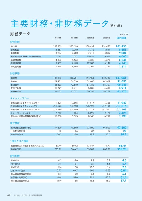 主要財務・非財務データ(5か年)財務データ単位:百万円2017年度2018年度2019年度2020年度2021年度経営成績売上高147,805150,650139,432134,470141,936営業利益8,3639,0807,3728,5118,651経常利益8,2049,2007,6118,8079,084親会社株主に帰属する当期純利益6,5796,39113,0915,3326,660減価償却費4,8964,5334,6825,3785,244設備投資額3,9697,43012,3885,1494,145研究開発費1,2881,1091,1651,1341,214財政状態総資産141,116138,251144,956142,743147,061純資産69,90974,31082,84087,36792,055自己資本68,33272,68081,36285,70790,243有利子負債11,7294,9115,0854,4383,914利益剰余金22,03126,57136,73838,75743,175経営指標ROA(%)4.74.69.23.74.6ROIC(%)7.38.15.96.66.4ROE(%)9.68.817.06.47.6D/Eレシオ(倍)0.170.070.060.050.04売上高営業利益率(%)5.76.05.36.36.1自己資本比率(%)48.452.656.160.061.4海外売上高比率(%)15.915.515.816.017.71株当たりの情報親会社株主に帰属する当期純利益(円)67.4965.62134.4754.7768.47純資産(円)700.99746.42835.82880.28928.28株式情報発行済株式総数(千株)97,50097,50097,50097,50097,500一株配当金(円)1826372227配当性向(%)26.739.627.540.239.5キャッシュフロー営業活動によるキャッシュフロー9,3289,80511,0174,36511,942投資活動によるキャッシュフロー△1,575△9,620△5,922△2,191△7,516財務活動によるキャッシュフロー△9,160△9,160△3,115△4,292△3,166フリー・キャッシュフロー7,7521845,0952,1744,425現金および現金同等物残高(期末)15,8006,8358,7466,7127,79067タキロンシーアイグループ統合報告書2022