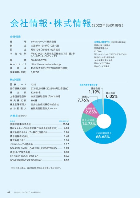 会社情報・株式情報(2022年3月末現在)会社情報主要加入団体リスト(2022年5月末現在)商号創立設立本社住所電話Webサイト資本金従業員数(連結)タキロンシーアイ株式会社大正8年(1919年)10月10日昭和10年(1935年)12月20日〒530-0001大阪市北区梅田三丁目1番3号(ノースゲートビルディング)06-6453-3700https://www.takiron-ci.co.jp15,204百万円(2022年8月22日現在)3,227名関西化学工業協会関西経済連合会CLOMA(クリーン・オーシャン・マテリアル・アライアンス)塩化ビニル管・継手協会JA包装園芸資材協会日本インテリア協会日本ビニル工業会株式情報証券コード発行済株式総数株主数上場証券取引所単元株式数株主名簿管理人会計監査人421597,553,655株(2022年8月22日現在)12,681名東京証券取引所プライム市場100株三井住友信託銀行株式会社有限責任監査法人トーマツ大株主(上位10名)株主名持株比率(%)伊藤忠商事株式会社日本マスタートラスト信託銀行株式会社(信託口)株式会社日本カストディ銀行(信託口)積水樹脂株式会社株式会社カネカタキロンシーアイ持株会DFAINTLSMALLCAPVALUEPORTFOLIO渡辺パイプ株式会社REFUND107-CLIENTACGOVERNMENTOFNORWAY(注)持株比率は、自己株式を控除して計算しております。55.546.281.851.401.351.171.090.900.660.52株式の所有者別分布その他国内法人66.65個人・その他14.73金融機関9.65外国人7.76証券会社1.19自己株式0.0269