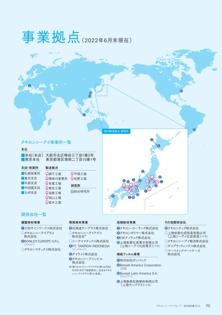 683111495786516115715123961013124141026事業拠点(2022年6月末現在)■本社(本店)大阪市北区梅田三丁目1番3号■東京本社東京都港区港南二丁目15番1号■札幌営業所■東北支店■中部支店■中四国支店■九州支店網干工場揖保川事業所安富工場東京工場滋賀工場岡山工場栃木工場総合研究所本社支店・営業所建築資材事業環境資材事業高機能材事業その他関係会社製造拠点研究所タキロンシーアイ事業所一覧関係会社一覧❶三和サインワークス株式会社○キロンシーアイプラス株式会社❷BONLEXEUROPES.R.L.[イタリア]○キロンマテックス株式会社❸北海道サンプラス株式会社○キロンシーアイアグリ株式会社※○シーアイマテックス株式会社❹PT.TAKIRONINDONESIA[インドネシア]❺ダイライト株式会社❻タキロンシーアイシビル株式会社※(株)ヨコビとシーアイアグロ(株)は2022年4月1日付で経営統合し、社名をタキロンシーアイアグリ(株)に変更。❼タキロン・ローランド株式会社❽タキロンポリマー株式会社❾CIKナノテック株式会社❿海希愛化成電子有限公司(上海シーアイ化成電子)[中国]⓫株式会社ボンパック⓬onsetAmericaCorporation[米国]⓭onsetLatinAmericaS.A.[ウルグアイ]⓮海桑普拉斯塑料有限公司(上海サンプラス)[中国]⓯タキロンテック株式会社○海世愛化成貿易有限公司(上海シーアイ化成貿易)[中国]○キロンシーアイ物流株式会社○イプラ・ウィンテス株式会社○ーベリックパートナーズ株式会社機能フィルム事業1234567平塚工場佐野工場8910国内製造拠点・研究所70